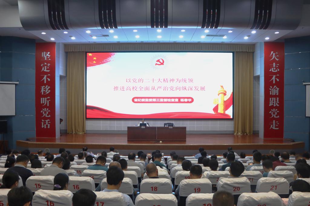 杨春华从“全面从严治党开辟百年大党自我革命新境界”“近年查处的严重违纪违法涉嫌犯罪案件带给我们的警示”“深刻把握高校全面从严治党的任务要求、形势问题”“深刻把握推动高校全面从严治党向纵深发展的工作路径”等四个方面深刻分析解读了当前全面从严治党、党风廉政建设和反腐败斗争面临的新形势新任务,并通过大量典型案例警示、警醒大家,教育大家要明纪律、知敬畏、存戒惧、做表率。