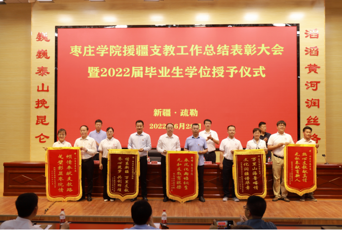 仲夏六月,万物华实;疏勒大地,瓜果飘香。6月28日上午,枣庄学院援疆支教工作总结表彰大会暨2022届毕业生学士学位授予仪式在疏勒县齐鲁疏勒第二中学多功能报告厅举行。我校党委书记曹胜强,山东省援疆工作指挥部党委副书记邓泽宇,疏勒县委教育工委副书记、县教育局党组书记赵彬出席会议,我校相关部门工作人员,疏勒县教育局、受援学校有关领导以及支教团全体师生参加会议。会议由东营市援疆工作指挥部党委副书记、副指挥,疏勒县委常委、副县长刘海峰主持。