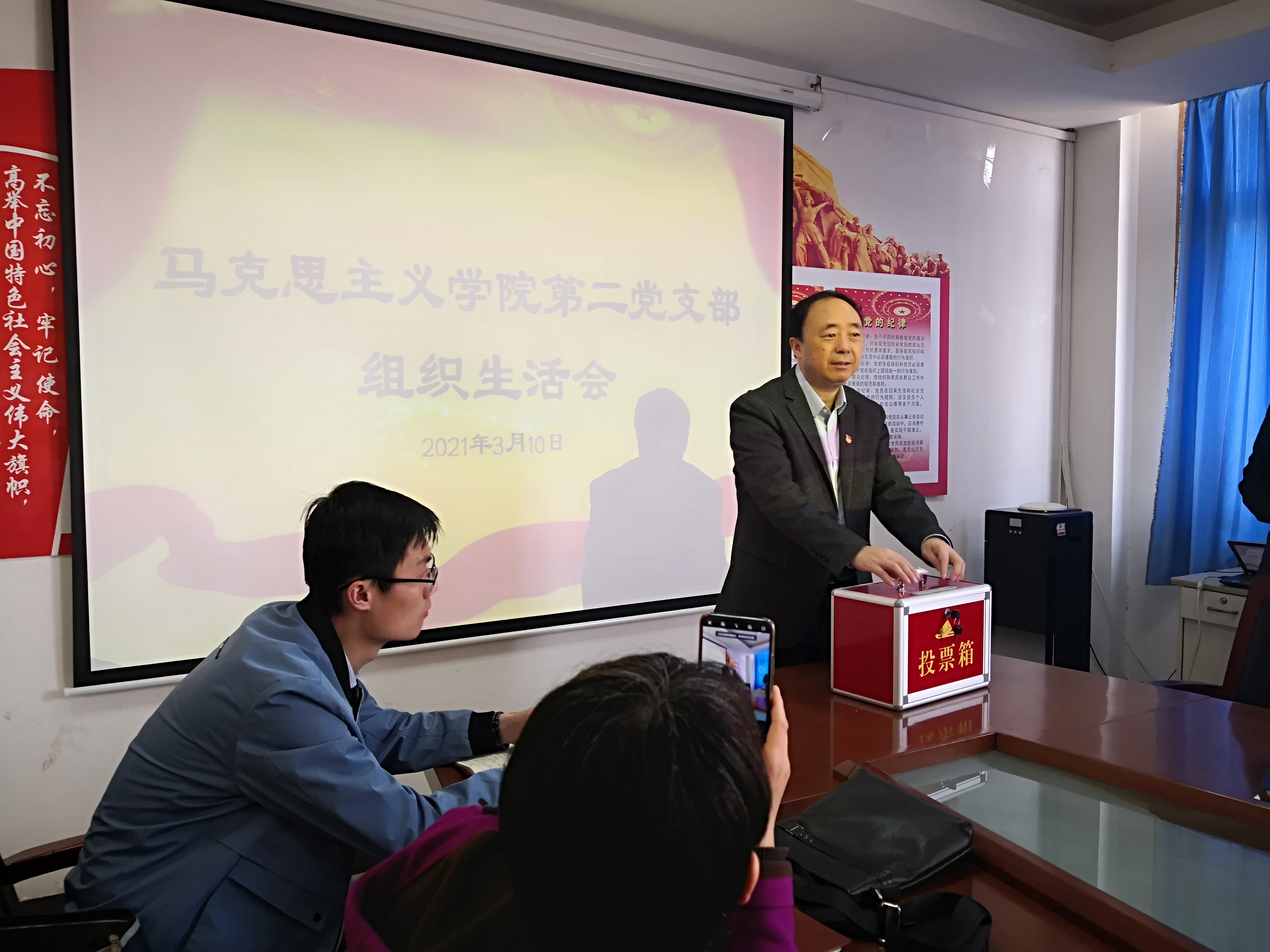 3月10日下午,校党委书记曹胜强参加马克思主义学院第二党支部组织生活会和民主评议党员活动。支部全体党员参加,党支部书记刘新全主持会议。