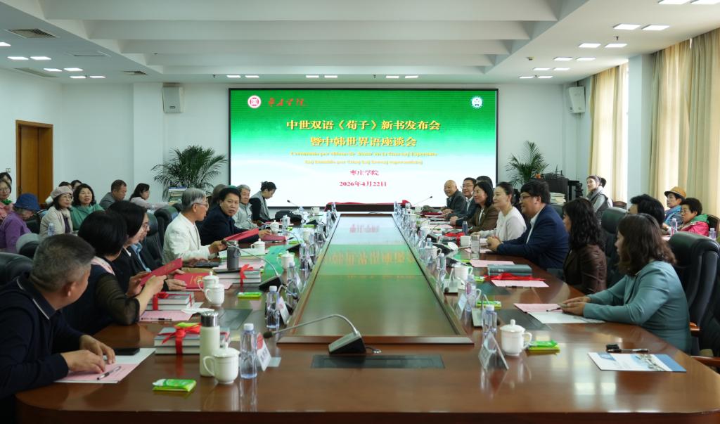 4月22日,中世双语《荀子》新书发布会暨中韩世界语座谈会在市中校区综合楼三楼会议室举行。中国外文局亚太传播中心世界语部主任、中华全国世界语协会秘书长陈吉,校党委副书记、校长丛海林,党委委员、副校长褚夫敏,党委委员、宣传部部长闫昕出席会议。