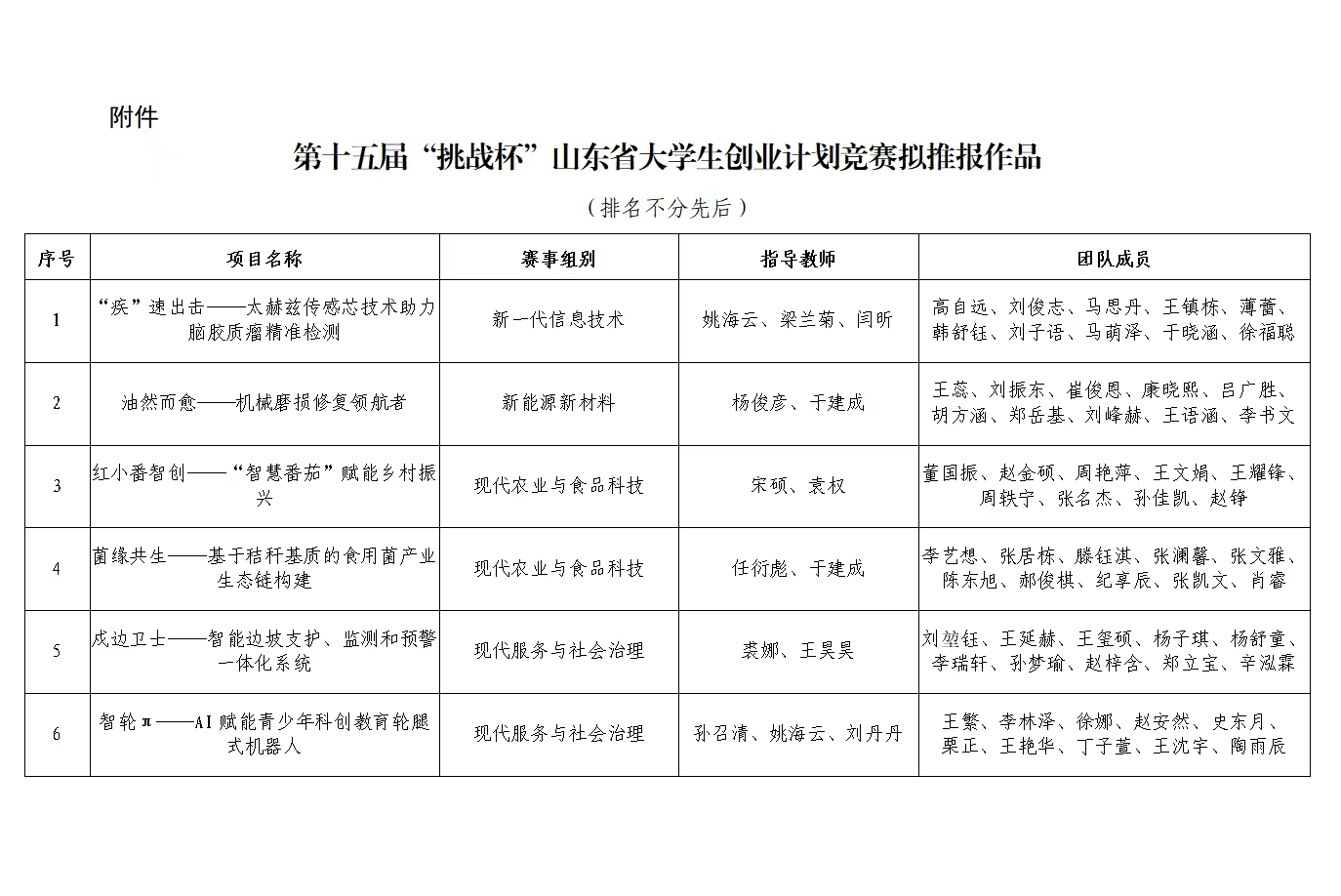 根据《关于举办第十五届“挑战杯”山东省大学生创业计划竞赛的预通知》要求,经学院推荐、校内初审、网络评审、专家评议等环节,拟推荐以下6件作品参加第十五届“挑战杯”山东省大学生创业计划竞赛,现将名单予以公示(排名不分先后)。