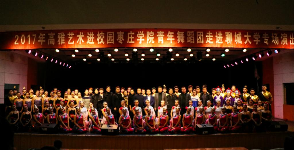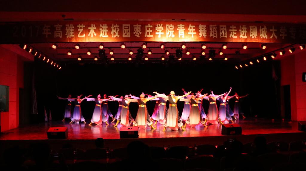 为贯彻落实国家“进一步繁荣高雅艺术,丰富校园文化,提高学生综合素质”的要求,11月24日下午,在音乐与舞蹈学院院长李永、副院长郑发奋和舞蹈教研室赵鑫主任等各位老师的带领下,作为回访,枣庄学院青年舞蹈团在聊城大学举行了“高雅艺术进校园”专场演出,为聊城大学的师生们带来了一场唯美的视觉盛宴。