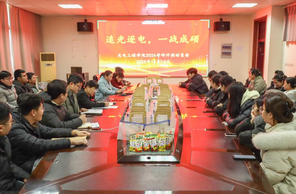 为进一步帮助光电学子缓解备考压力、坚定迎考信心,12月16日下午,光电工程学院在初教楼511会议室召开“追光逐电,一战成硕”--2026届考研冲刺动员会。会议采取“线上+线下”同步方式进行,学院党政领导、毕业班班主任、辅导员及2026届考研学生参加。