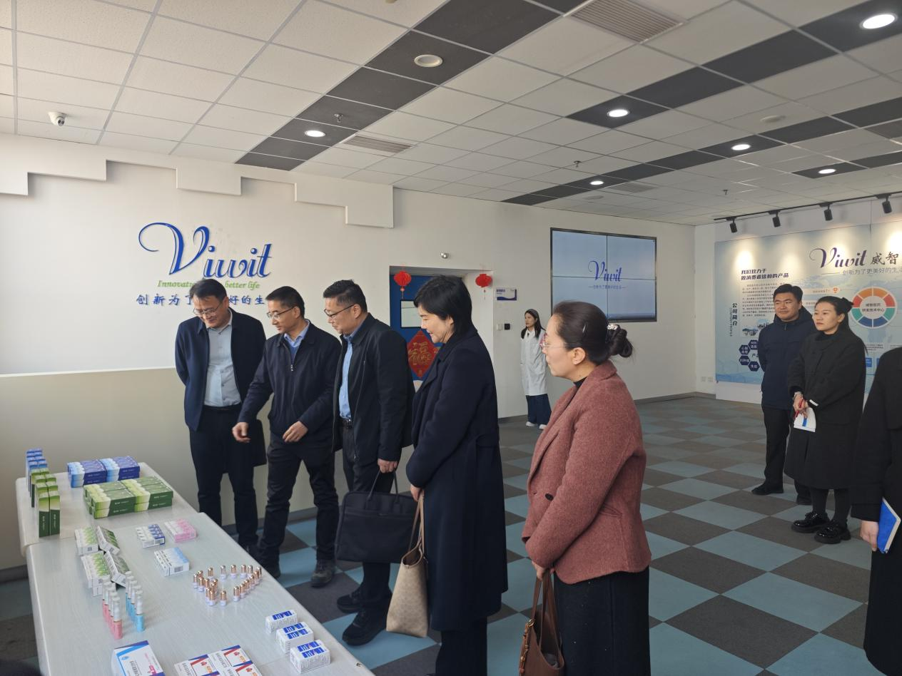 在威智医药总裁魏彦君等公司领导的陪同下,林勇一行实地考察了威智医药实验室及药品展示区,深入了解企业人才团队建设、药品研发流程、战略发展布局及质量管理体系等情况。林勇对威智医药近年来在医药研发领域取得的显著成绩和强劲发展态势给予高度评价,并表示希望以此次考察为契机,推动双方在实习实训、科研攻关等方面实现更深层次合作。