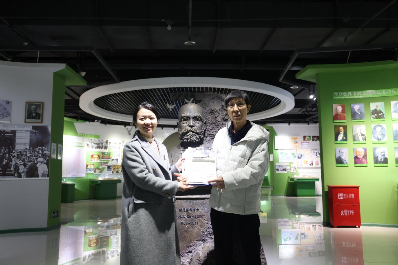 年近80岁高龄的李江湖先生先后参观国际世界语协会亚洲图书馆、文物修复室、红色世界语者系列展——叶籁士与中国的世界语之路展览、世界语博物馆。世界语建设研究专家孙明孝介绍了博物馆建设历程和部分珍贵藏品,以及有关山西世界语运动藏品收集情况。参观中,李先生难掩激动,并动情表示,博物馆不仅完成了世界语相关文物的收藏与保护,更对世界语文化遗产的精神传承与研究具有重要意义。