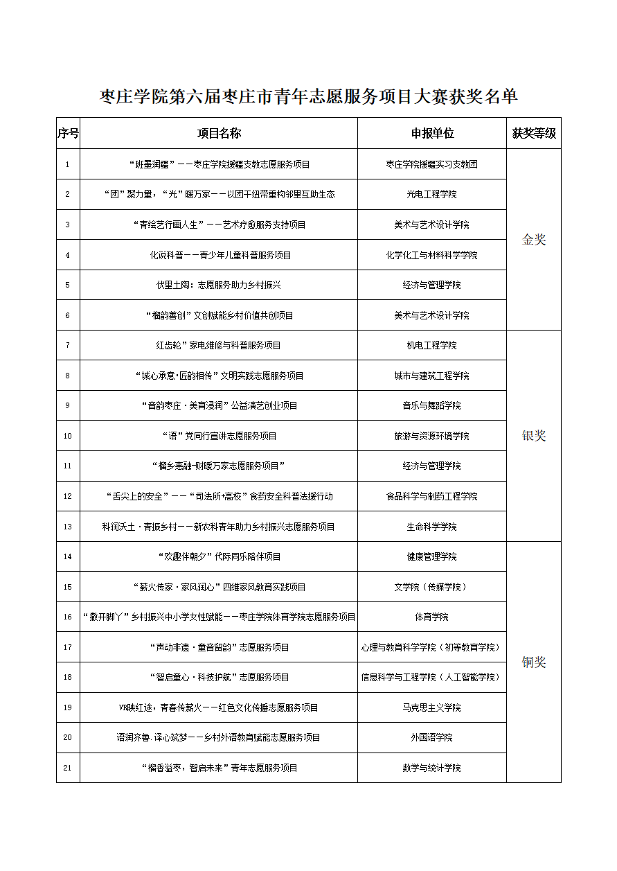 近日,第六届枣庄市青年志愿服务项目大赛获奖名单公示,我校21个申报项目悉数获奖,其中“班墨润疆”援疆支教等6个项目荣获金奖,“科润沃土·青振乡村”新农科助力振兴等7个项目荣获银奖,“VR映红途,青春传薪火”红色文化传播等8个项目荣获铜奖,学校获评大赛优秀组织单位。