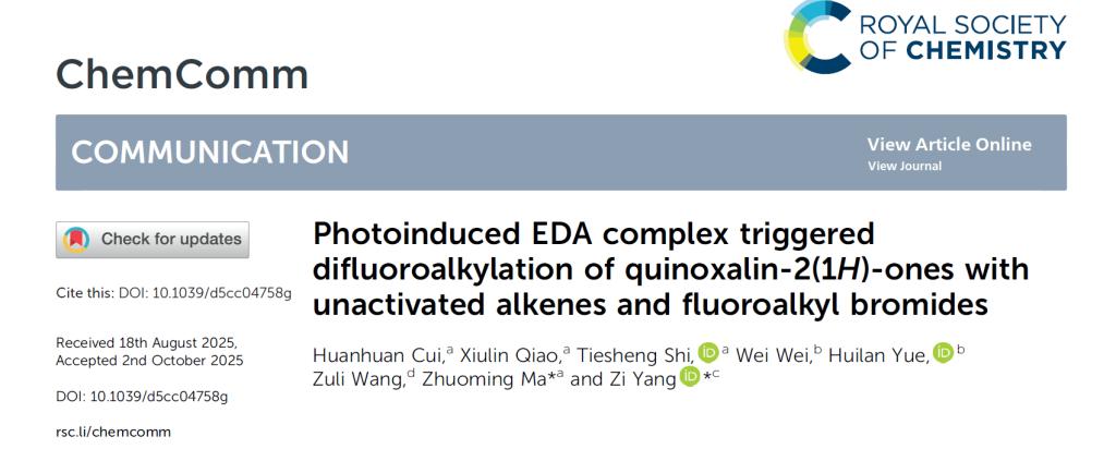 研究成果二:《Photoinduced EDA complex triggered difluoroalkylation of quinoxalin-2(1H)-ones with unactivated alkenes and fluoroalkyl bromides》。本研究开发了一种新颖、实用的光化学方法,用于合成C3-二氟烷基化的喹喔啉酮类化合物。其最大的亮点在于巧妙利用底物自身形成EDA复合物,完全规避了金属催化剂和外源光催化剂的使用,体现了绿色化学和步骤经济性的核心理念。这项工作不仅为含氟喹喔啉酮库的快速构建提供了强大工具,也为其在药物发现和功能材料中的应用开辟了新的可能性。更重要的是,这种基于EDA复合物的催化模式为其他类型惰性化学键的活化与官能团化提供了新的思路和借鉴。崔环环博士为本论文第一作者,枣庄学院为第一完成单位。该研究得到山东省自然科学基金和枣庄学院博士基金等项目支持。