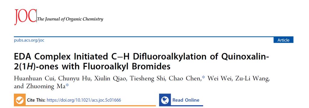 近日,我校化学化工与材料科学学院“化学生物学创新团队”崔环环博士在光诱导EDA复合物——解锁喹喔啉酮绿色、高效二氟烷基化方面取得了重要的研究进展,相关研究成果发表于国际知名期刊《The Journal of Organic Chemistry》和《Chemical Communications》。