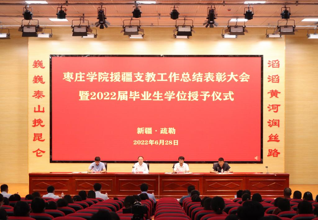 仲夏六月,万物华实;疏勒大地,瓜果飘香。6月28日上午,枣庄学院援疆支教工作总结表彰大会暨2022届毕业生学士学位授予仪式在疏勒县齐鲁疏勒第二中学多功能报告厅举行。我校党委书记曹胜强,山东省援疆工作指挥部党委副书记邓泽宇,疏勒县委教育工委副书记、县教育局党组书记赵彬出席会议,我校相关部门工作人员,疏勒县教育局、受援学校有关领导以及支教团全体师生参加会议。会议由东营市援疆工作指挥部党委副书记、副指挥,疏勒县委常委、副县长刘海峰主持。