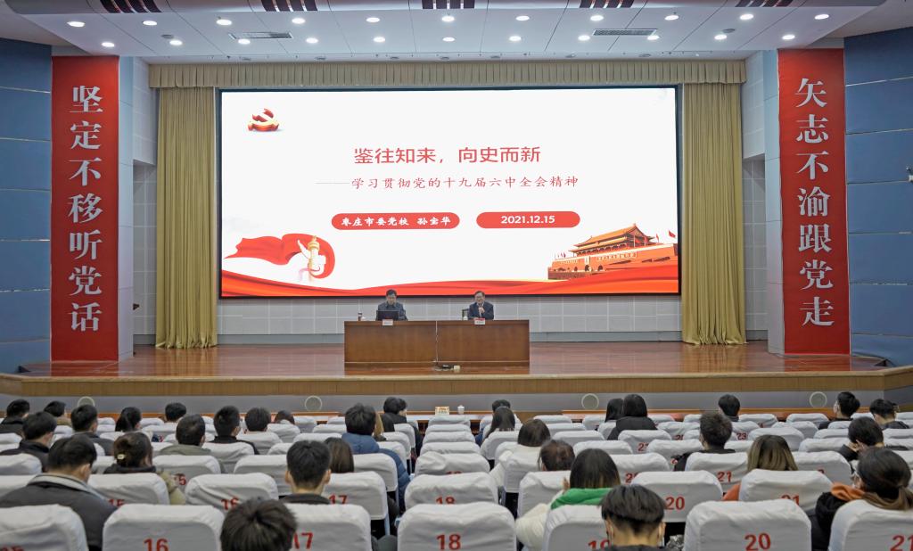 按照市委统一部署,12月15日下午,市委宣讲团成员、市委党校教务处孙宝华教授莅临我校,在综合楼学术报告厅为师生作党的十九届六中全会精神宣讲报告。校党委委员、宣传部部长张昌林主持报告,市中校区学院团总支书记、辅导员、学生代表等200余人到场聆听报告。