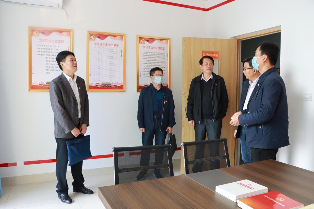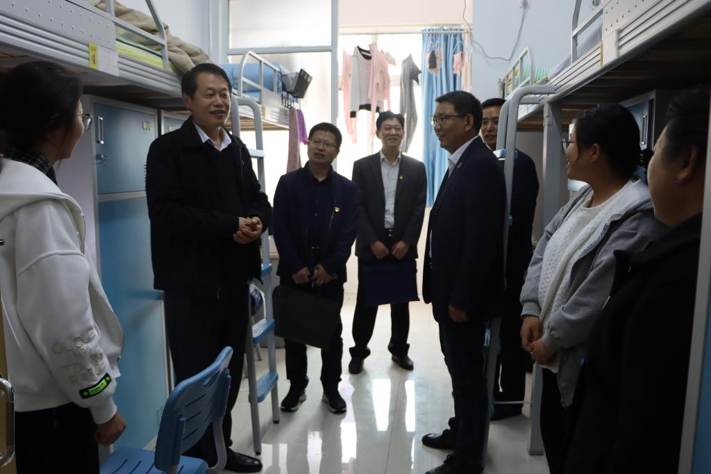 11月3日下午,省委党史学习教育第四巡回指导组成员时新华、吕建设在校党委副书记曾宪明陪同下,深入新城校区调研指导学生公寓活动室建设。