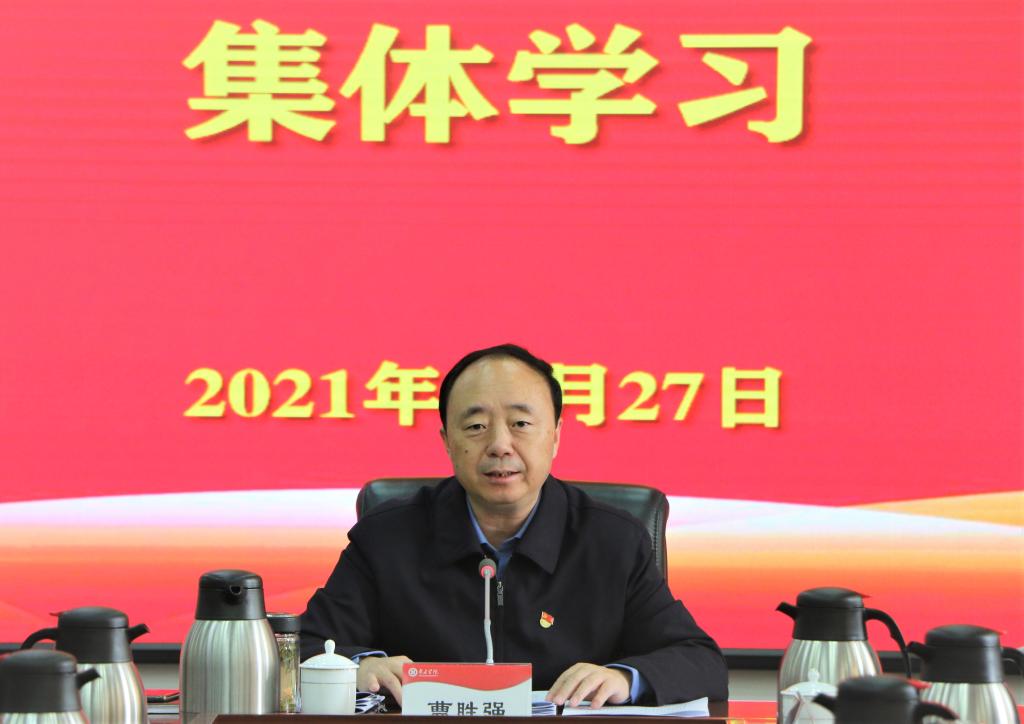 10月27日下午,我校党委理论学习中心组(扩大)在综合楼三楼会议室集体学习研讨习近平总书记在深入推动黄河流域生态保护和高质量发展座谈会上的重要讲话精神和视察山东重要指示要求。校党委书记曹胜强主持学习并讲话。校党委委员李文喜、曾宪明、李目海、丰雷、安涛、孙正、林勇,办公室、学生工作处、教务处、科技处、社会科学处、合作发展处等部门负责人,各党总支书记参加学习。