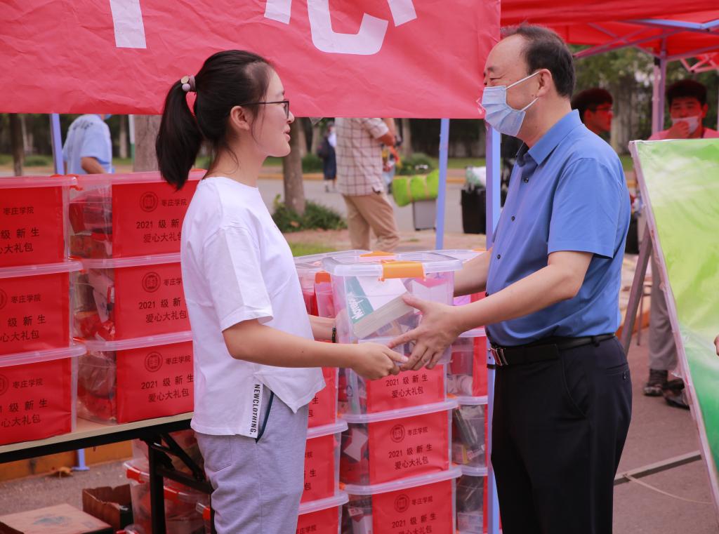 为保证家庭经济困难新生顺利入学,在新生入校报到期间,学校为2021级家庭经济困难新生开通“绿色通道”,建立完整的资助保障体系,从制度上保障不让一个学生因家庭经济困难而失学。在迎新现场,校领导为家庭经济困难新生送上了“爱心大礼包”,并与新生亲切交流,勉励他们尽快适应校园生活,砥砺奋进、不负韶华。