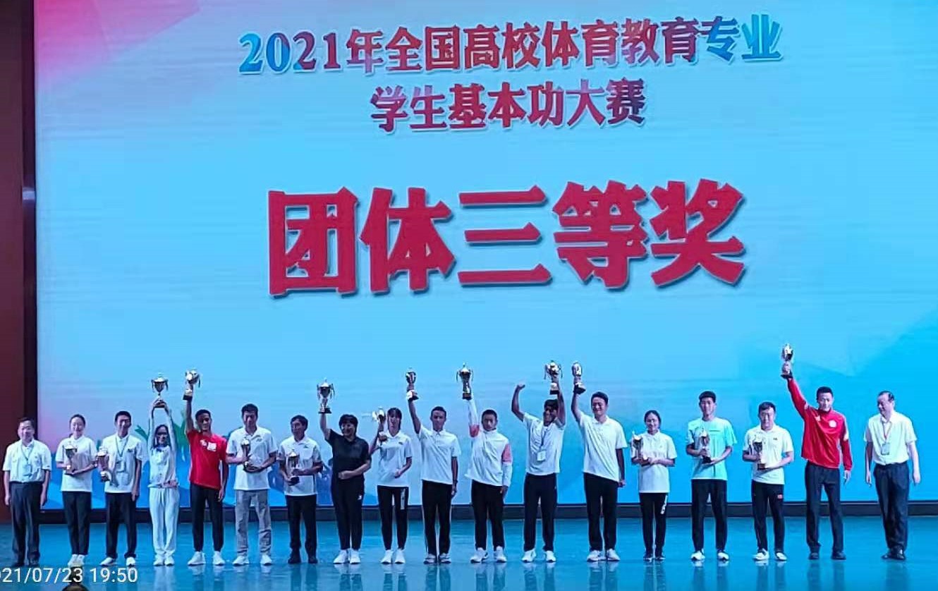 本次竞赛分为基础理论知识与教学技能类、运动技能类两大部分内容,我校代表队8名队员勇于拼搏,奋勇争先,获得球类单项奖第四名、理论知识与教师技能类三等奖、运动技能类三等奖、团体奖三等奖、体育道德风尚奖以及两名优秀运动员奖,充分展示了我校体育教育专业学生扎实的专业知识、技术和良好的精神风貌。