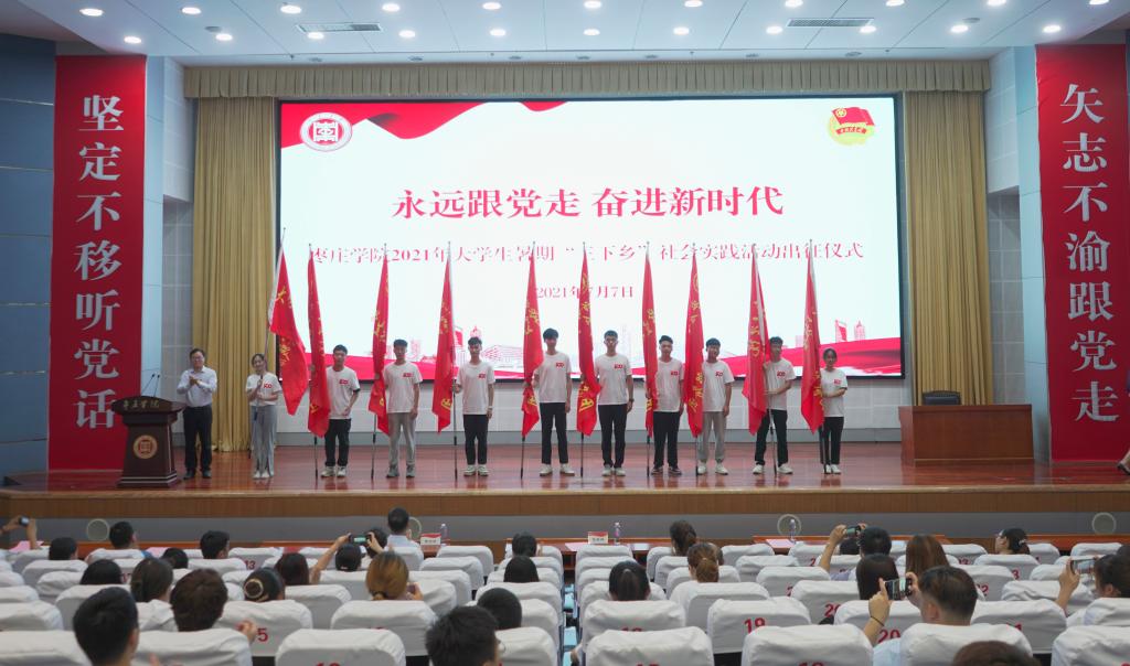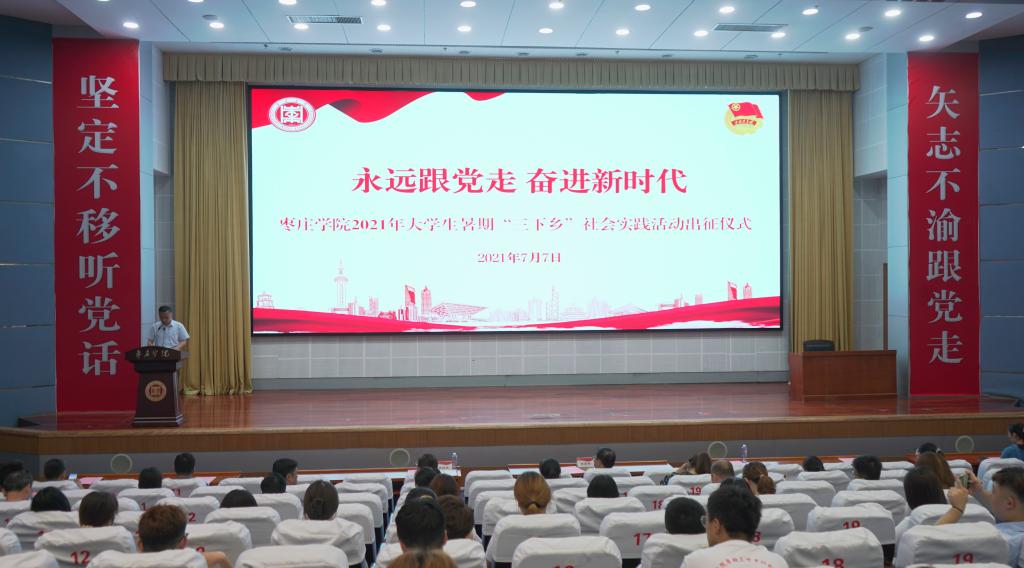 7月7日下午,“永远跟党走 奋进新时代”枣庄学院2021年大学生暑期“三下乡”社会实践活动出征仪式在综合楼报告厅举行。校党委委员、宣传部部长张昌林出席仪式,团委全体人员、各学院团总支负责人、校院两级实践团队成员共200余人参加仪式。