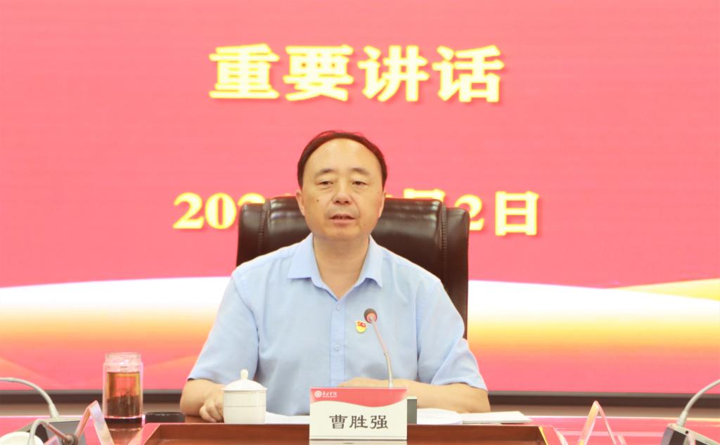 曹胜强强调,要聚焦立德树人根本任务,弘扬党的光荣传统、赓续红色血脉,努力培养担当民族复兴大任的时代新人。我们要把学习贯彻习近平总书记庆祝中国共产党100周年大会上的重要讲话精神,当做当前和今后一个时期的重大政治任务。新的征程上,我们必须坚持党的基本理论、基本路线、基本方略,统筹推进“五位一体”总体布局、协调推进“四个全面”战略布局,全面深化改革开放,立足新发展阶段,完整、准确、全面贯彻新发展理念,构建新发展格局,推动高质量发展,推进科技自立自强。我们要把习近平总书记的讲话精神贯彻到学校事业发展上来,贯彻到学校党委确定的“三步走”战略安排、“五大强校”发展战略、“十大工程”结合起来,推动学校高质量发展。