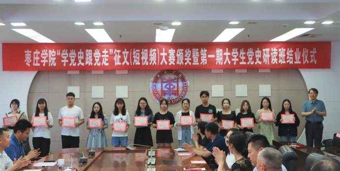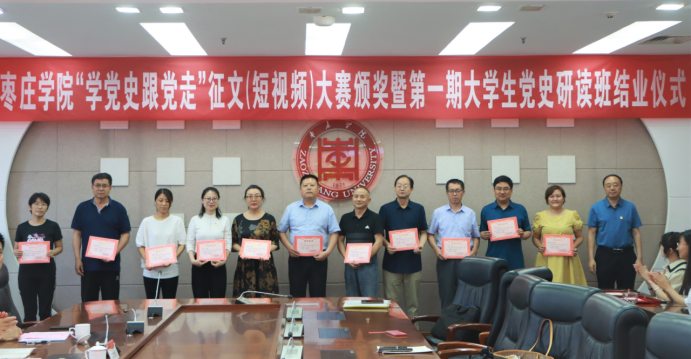 6月17日,枣庄学院“学党史、跟党走”主题征文(短视频)大赛颁奖暨第一期党史研读班结业仪式在综合楼三楼会议室举行。校党委书记曹胜强,党委副书记曾宪明,党委委员、宣传部部长张昌林出席会议,并为获奖师生颁奖。校团委、马克思主义学院相关负责人,部分获奖师生及党史研读班学员代表参加活动,会议由马克思主义学院党总支书记郭勇主持。
