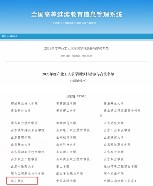 近日,经学校自主申报、山东省教育厅遴选推荐、教育部专家审读等严格程序,我校凭借扎实的办学基础、明确的合作规划及贴合产业需求的培养方案,成功入选2025年度产业工人“求学圆梦行动”参与高校名单,这标志着我校在服务产业工人学历提升与技能发展、深化产教融合领域迈出重要一步。