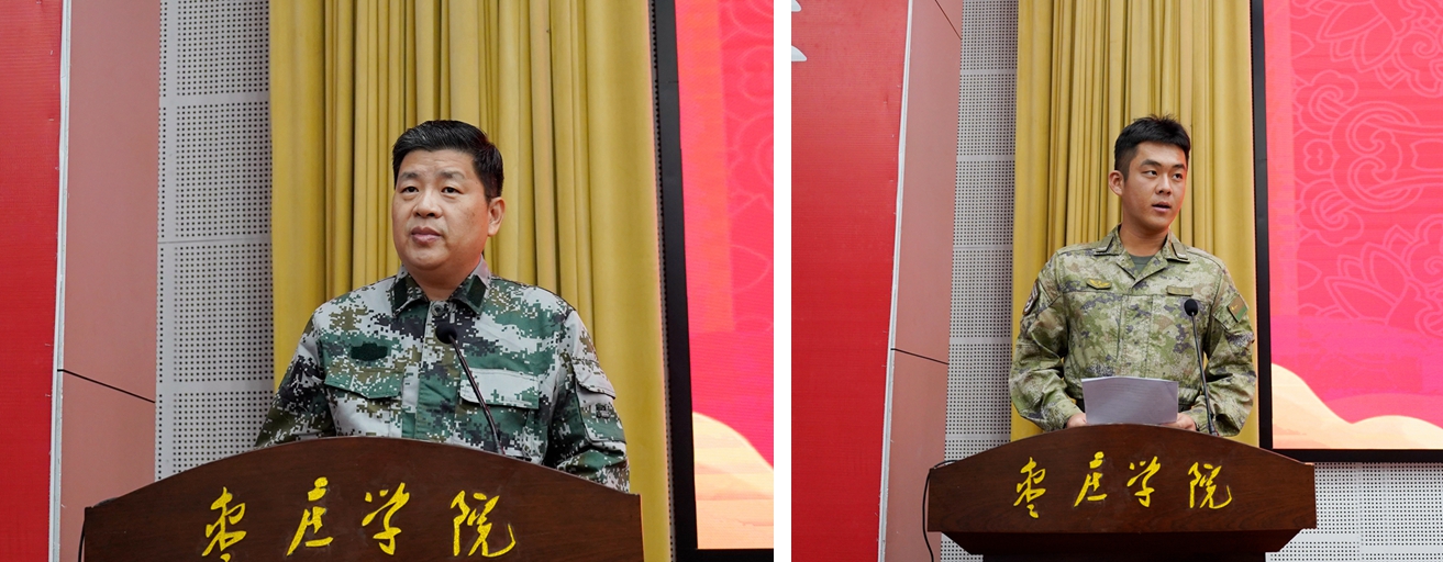 文学院(传媒学院)党委副书记周玉亮、军训教官代表张凯文分别作表态发言。