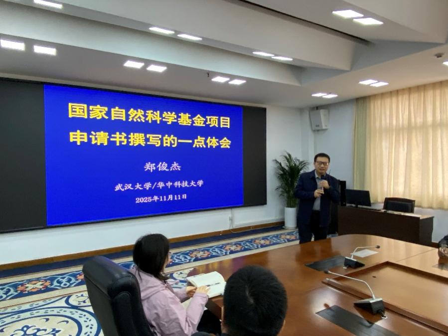 11月11日,我校“名师大讲堂”第六十四讲在市中校区综合楼三楼会议室举行。讲座特邀武汉大学/华中科技大学二级教授、博士生导师、教育部“长江学者特聘教授”郑俊杰教授作了题为《国家自然科学基金项目申请书撰写的一点体会》的专题报告。校党委委员、副校长褚夫敏出席并主持报告会。
