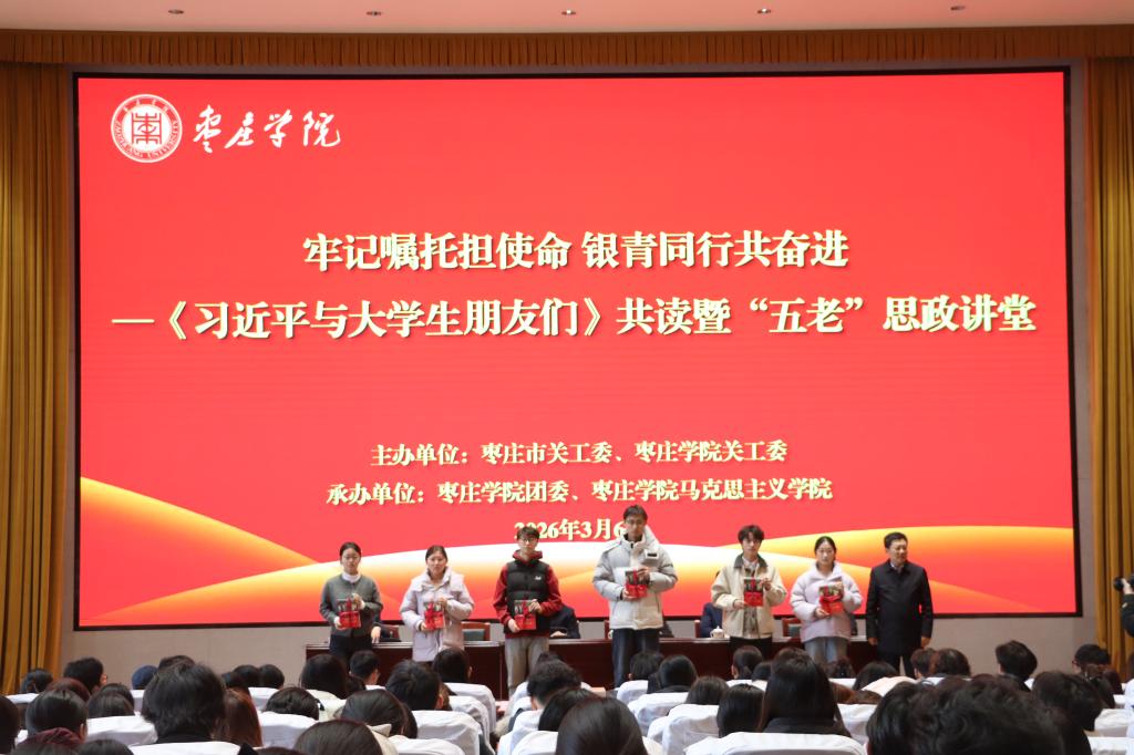 3月6日下午,由枣庄市关工委、枣庄学院关工委主办,校团委、马克思主义学院承办的《习近平与大学生朋友们》共读暨“五老”思政讲堂活动在我校薛城校区崇德楼报告厅举行。枣庄学院党委副书记、关工委主任丰雷出席并致辞。枣庄市关工委副主任、校关工委常务副主任徐玲主持活动,枣庄市关工委副主任兼秘书长史峰、副秘书长冯仰军出席。
