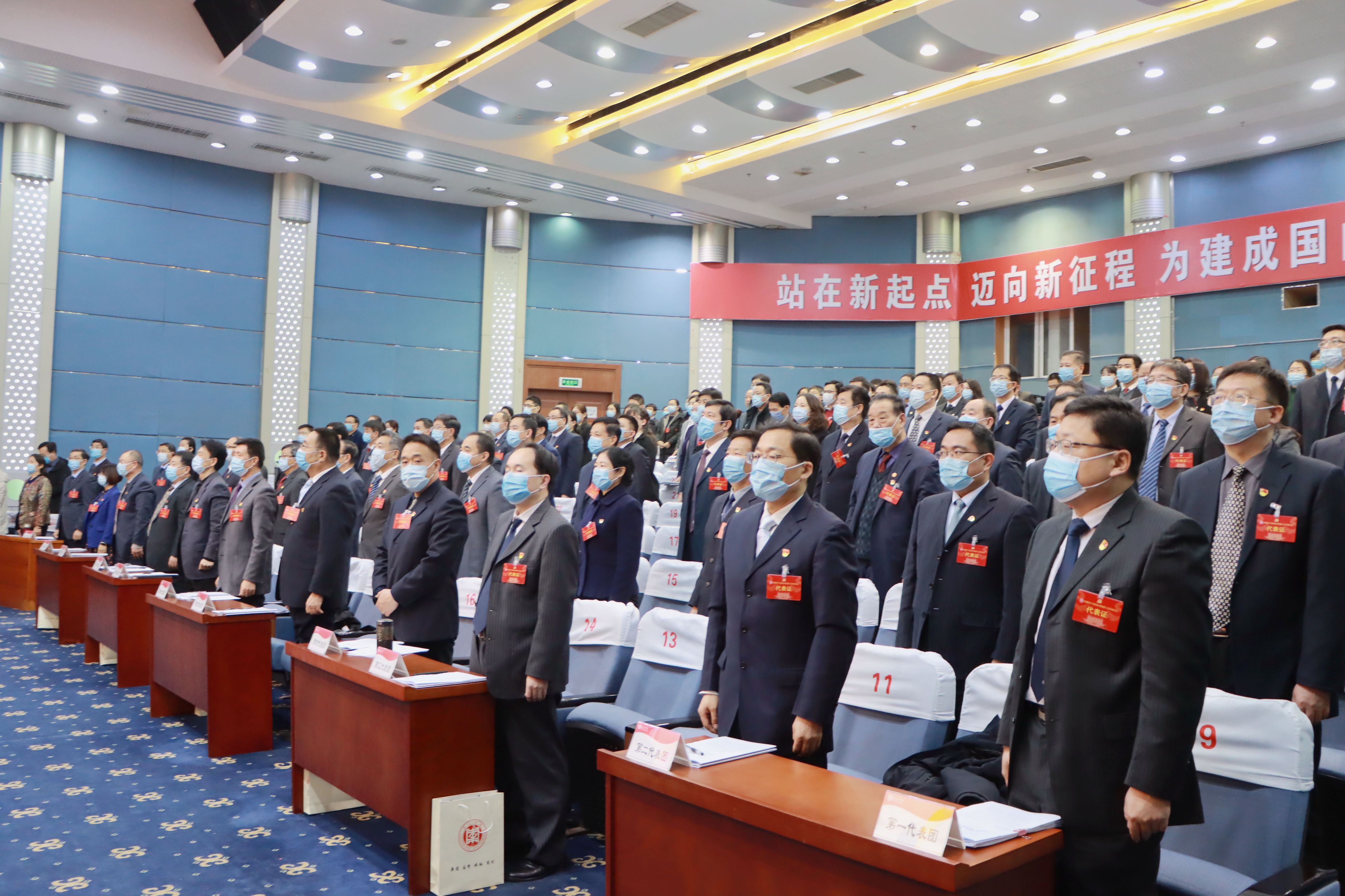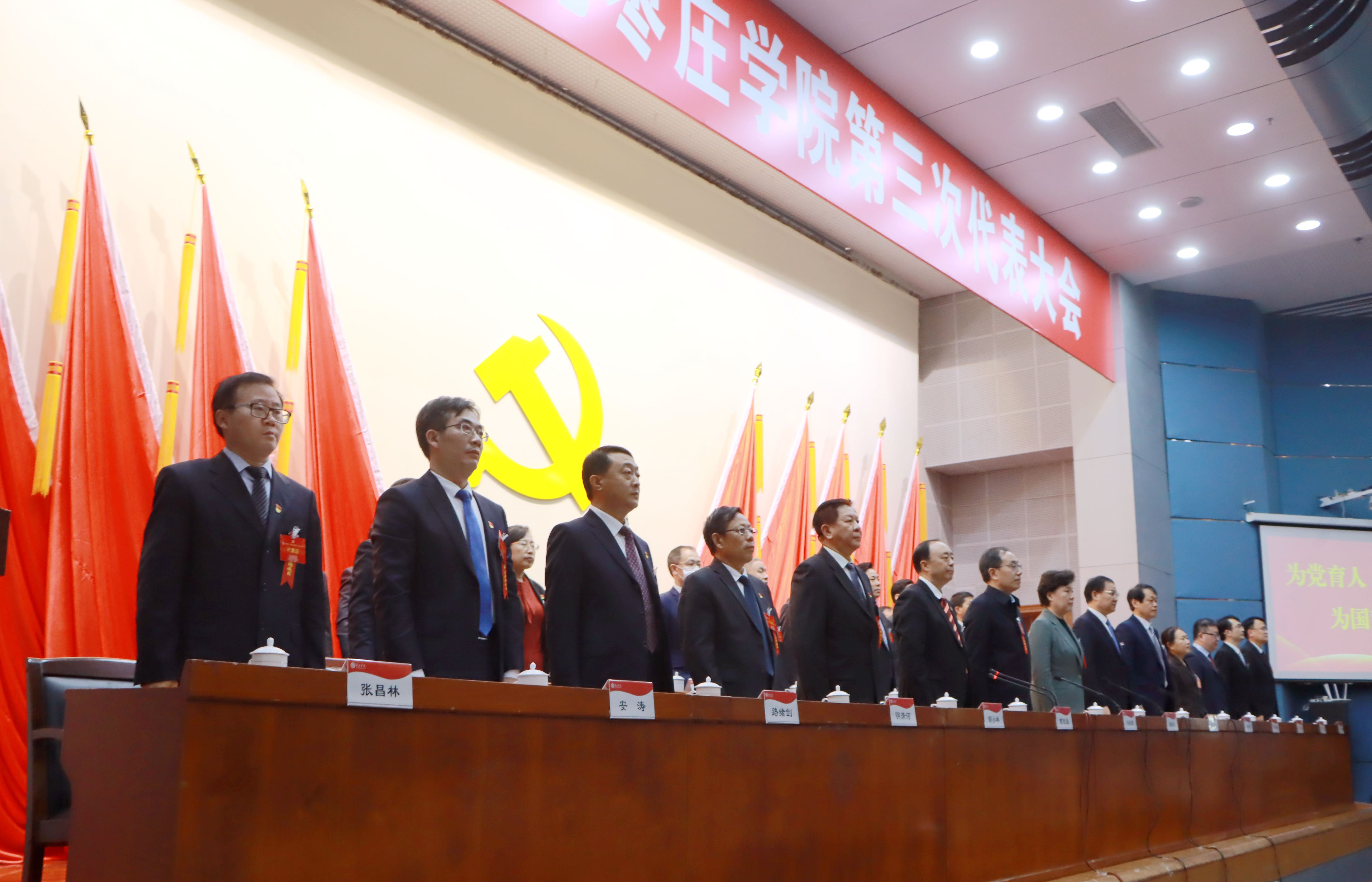 开幕式现场气氛庄严热烈。主席台上方悬挂着“中国共产党枣庄学院第三次代表大会”的红色条幅;十面鲜艳的党旗分列主席台两侧,正中簇拥着的党徽熠熠生辉。上午9时,李文喜宣布大会正式开幕。在雄壮的乐曲声中,全场起立,奏唱《中华人民共和国国歌》。