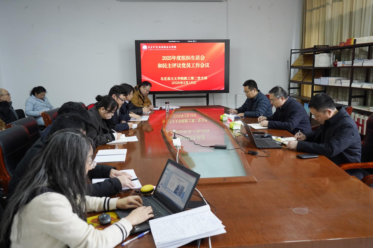 3月18日下午,马克思主义学院教工第二党支部在豁然楼A315党员活动室召开2025年度组织生活会和民主评议党员活动。校党委书记高峰以普通党员身份参加会议,与支部党员一起深入交流思想,认真检视剖析问题,明确努力方向。会议由党支部书记刘新全主持。
