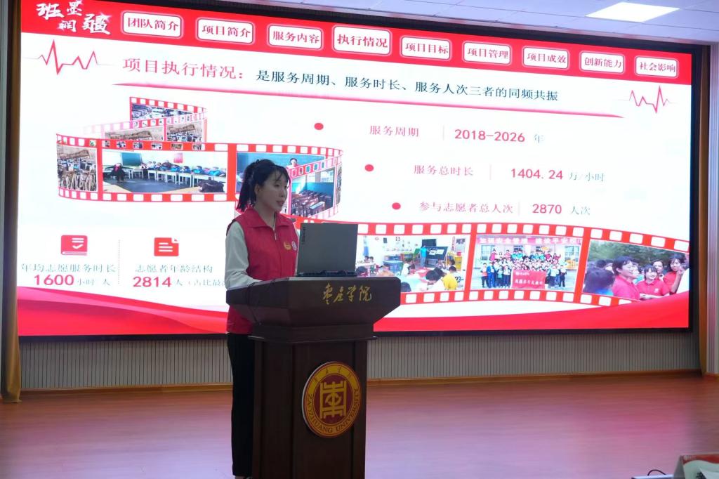 经过前期各二级学院推荐选拔,全校21支项目团队成功入围决赛答辩。各参赛团队以“项目视频展示+PPT汇报”的形式,全方位、多角度呈现项目实施细节、服务落地成效与未来发展规划,用创新实践诠释志愿精神,为现场观众带来了一场精彩纷呈的志愿风采展示。评审专家团紧扣目标明确性、管理规范性、项目成效、社会影响等核心评审维度,对各项目开展综合评议。
