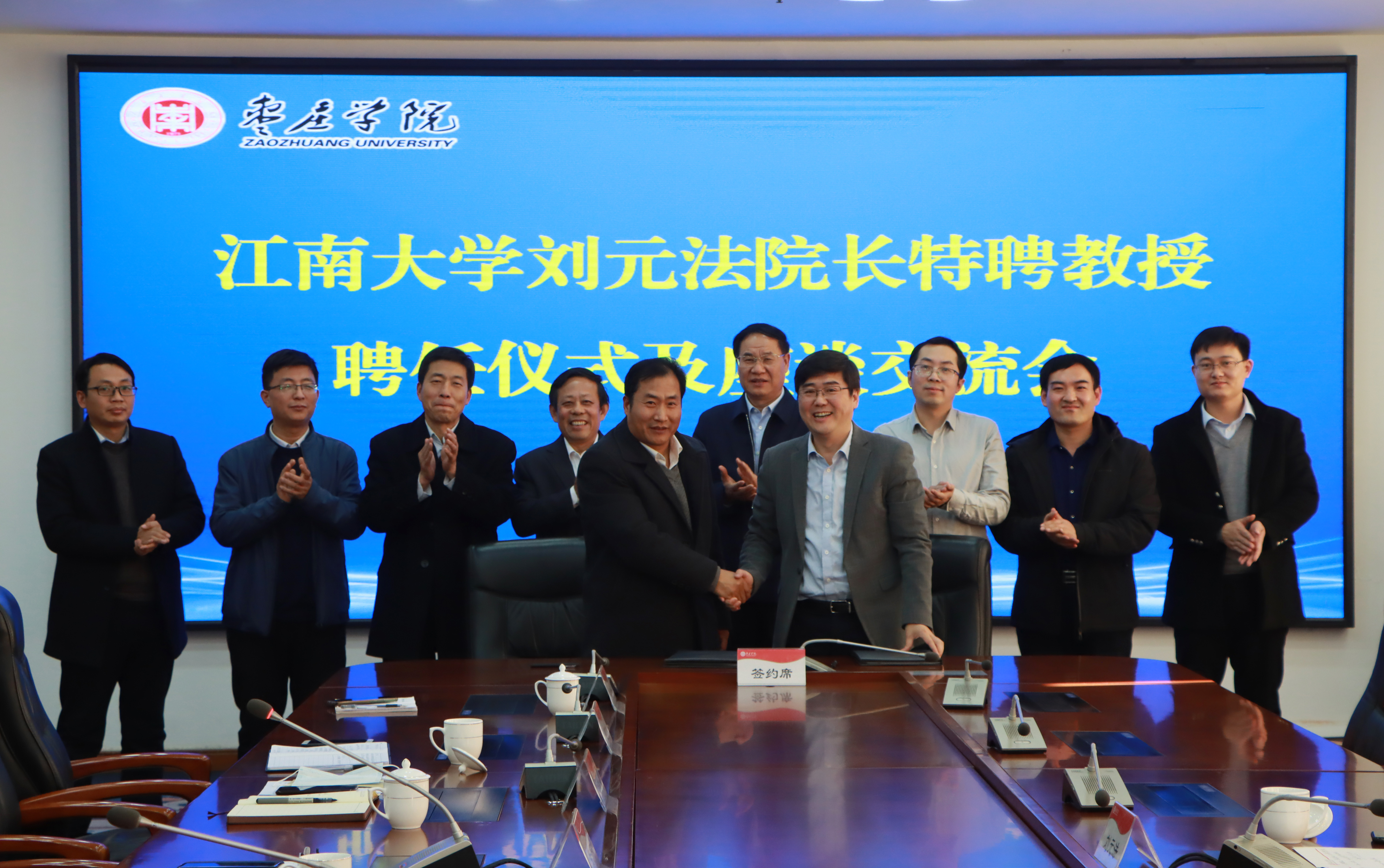张立华代表食品科学与制药工程学院与刘元法共同签订《江南大学食品学院结对帮扶枣庄学院食品科学与制药工程学院框架协议》。