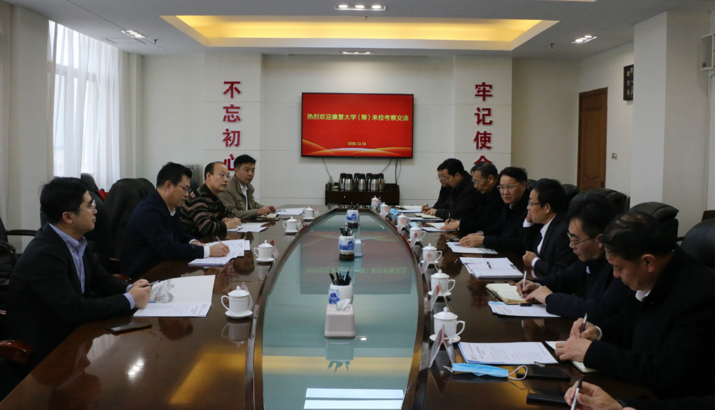 12月18日上午,康复大学(筹)领导小组成员、临时党委委员黄飞一行4人来校考察,就特色办学、人才引进、新校区建设等方面工作与我校进行交流探讨,校党委书记曹胜强、校长李文喜、副校长明清河在综合楼接待室会见了黄飞一行。
