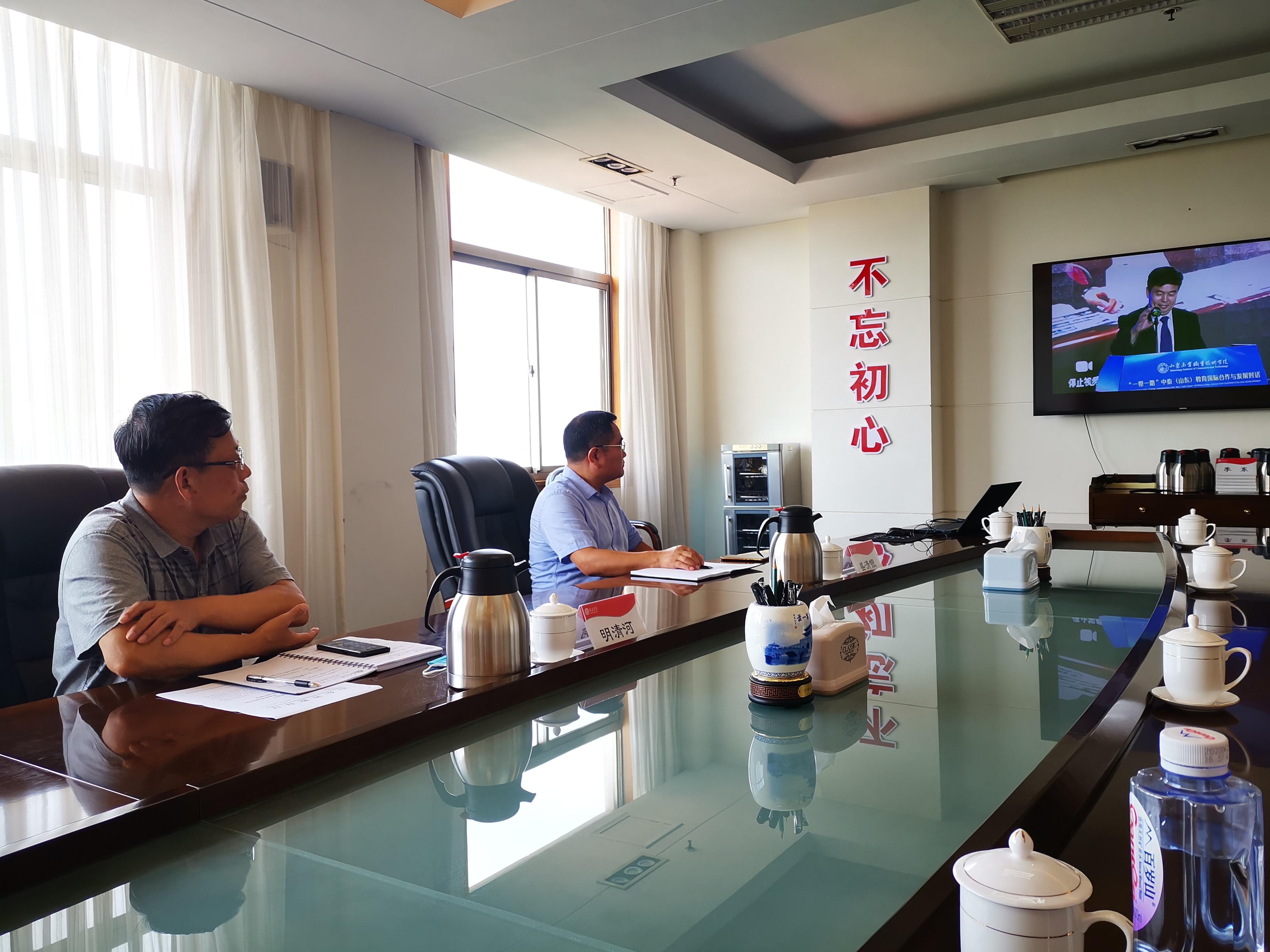 7月30日下午,“一带一路”中泰(山东)教育国际合作与发展对话会议召开,此次会议分别在中国济南和泰国曼谷设立主会场,省教育厅总督学邢顺峰、济南市教育局副局长刘绍辉、山东省教育国际交流协会会长张文新、省教育厅国际处处长江雨以及泰国教育部国际合作司司长Somsong、泰中教育联盟执行主席Montree等中泰嘉宾出席会议。我校在综合楼八楼会议室设立分会场,副校长明清河、国际合作交流处负责同志在分会场参加会议。