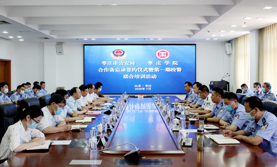 7月24日上午,枣庄市公安局与枣庄学院合作备忘录签约仪式暨第一期校警联合培训活动在我校综合楼三楼会议室举行,校党委书记曹胜强、副校长明清河,枣庄市公安局党委委员、副局长田传海出席活动,我校教务处、保卫处负责人,食品科学与制药工程学院院长、副院长及部分专任教师,食药环侦支队、森警支队支队长及支队全体同志,各分(市)局食药环侦大队负责同志,食药环侦及森警大队业务骨干参加活动。会议由食药环侦支队支队长张继军主持。