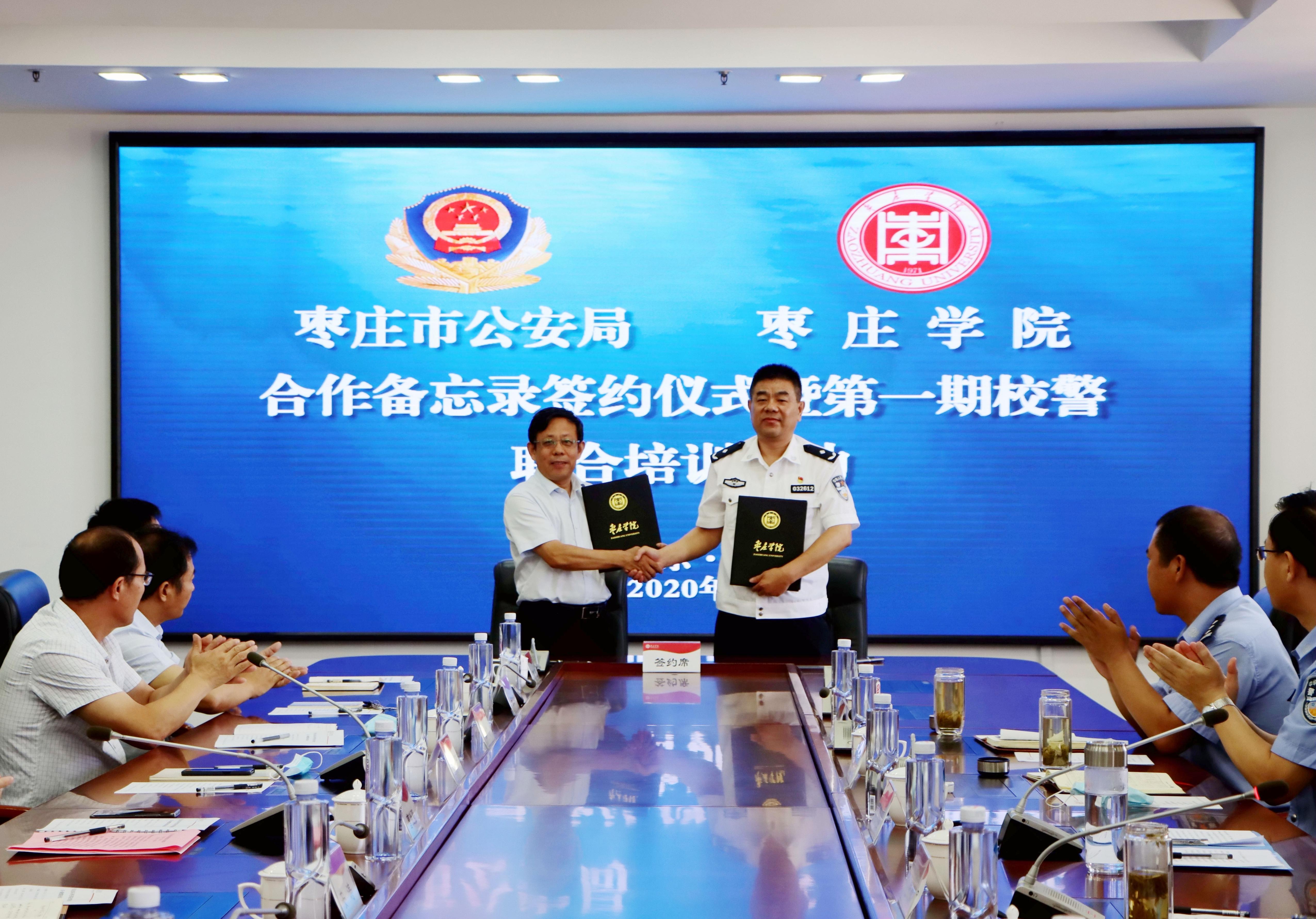 明清河、田传海签订枣庄市公安局与枣庄学院合作备忘录。