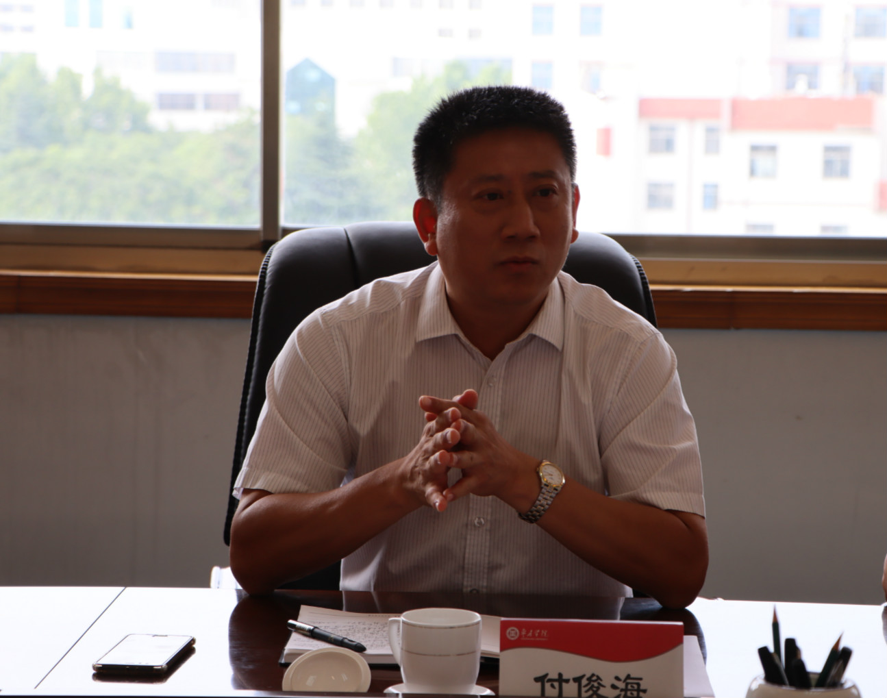 7月8日下午,省派民营企业高质量发展服务队枣庄一队(以下简称枣庄一队)成员付俊海等一行6人来校交流,校党委书记曹胜强、副书记曾宪明在校综合楼八楼会议室与枣庄一队举行座谈,办公室、组织部、科技处等部门负责人参加座谈。