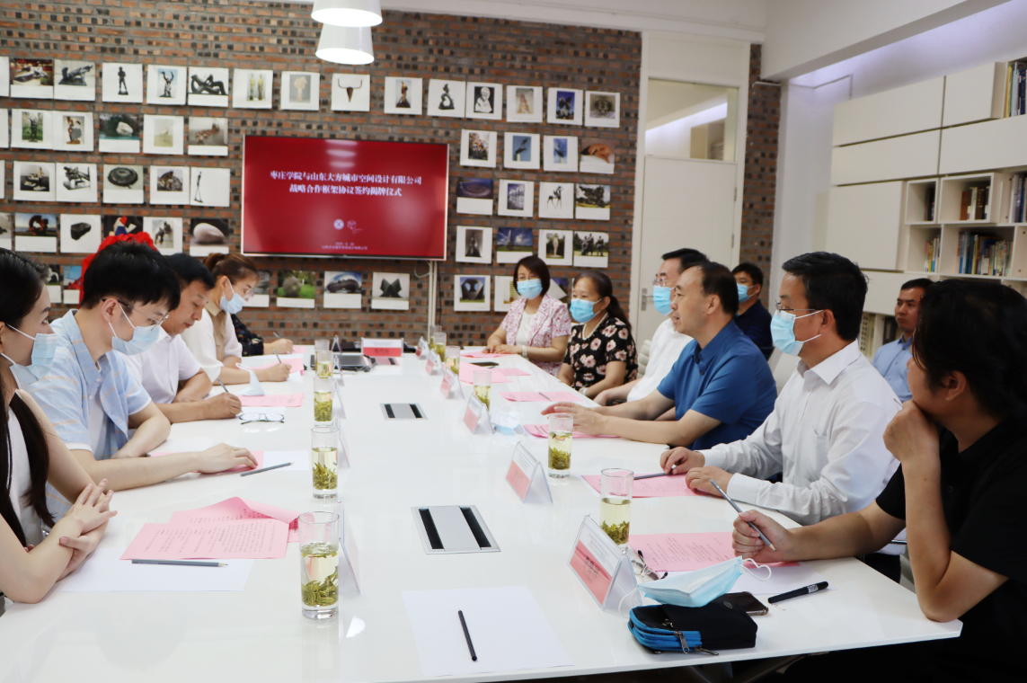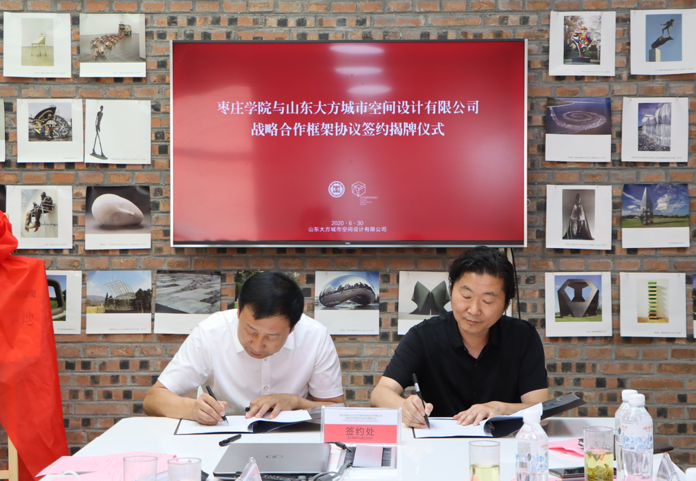 6月30日下午,枣庄学院—山东大方城市空间设计有限公司“文化创意产业校企联盟”研发合作签约暨揭牌仪式在山东大方城市空间设计有限公司会议室举行。校党委书记曹胜强、副校长李丽清,枣庄市委常委、宣传部部长、政法委书记、市委教育工委书记李爱杰,市委宣传部常务副部长张心立出席活动。校办公室、社会科学处、美术与艺术设计学院负责人,山东大方城市空间设计有限公司总经理朱林以及部分高层管理人员参加活动。本次活动由李丽清主持。