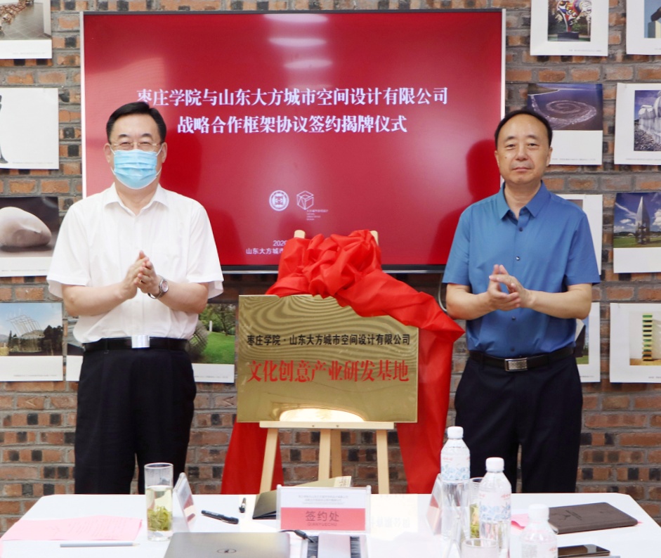 曹胜强和李爱杰共同为枣庄学院-山东大方城市空间设计有限公司“文化创意产业研发基地”揭牌。