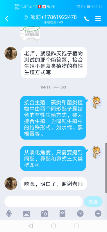 由于《植物学》是实践性很强的课程,在每次上课之前,韩老师都会精心准备上课用的各种植物材料等,以便同学们更直观的理解相关知识点。同时,老师会提前在雨课堂及QQ群中上传预习课件,发布学习任务,为开课做好准备。课中使用签到、屏幕分享(全屏投射课件)、语音同步、师生问答、随机点名、留言反馈等功能,与学生进行连麦答题互动、留言互动,确保学生的课堂关注力,活跃课堂气氛,尽力实现完全线上进行的混合式教学达到线下课堂的教学效果。为了给《植物学》的课程积累素材,每天都会到校园里寻找植物的分门别类的特征,进行拍照,添加到课件中,如棕榈、银杏的雌雄株的差别。