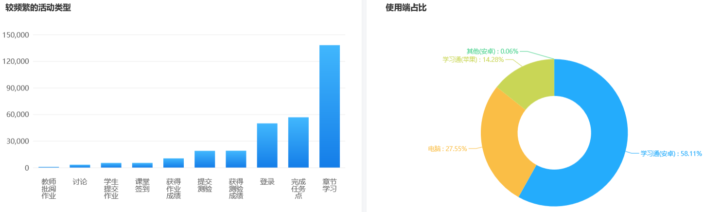 根据超星平台提供的大数据分析,可以查看本周课程打开次数、课程访问排行、较为频繁的活动类型、活跃度最高的院系和学习端口占比分别为: