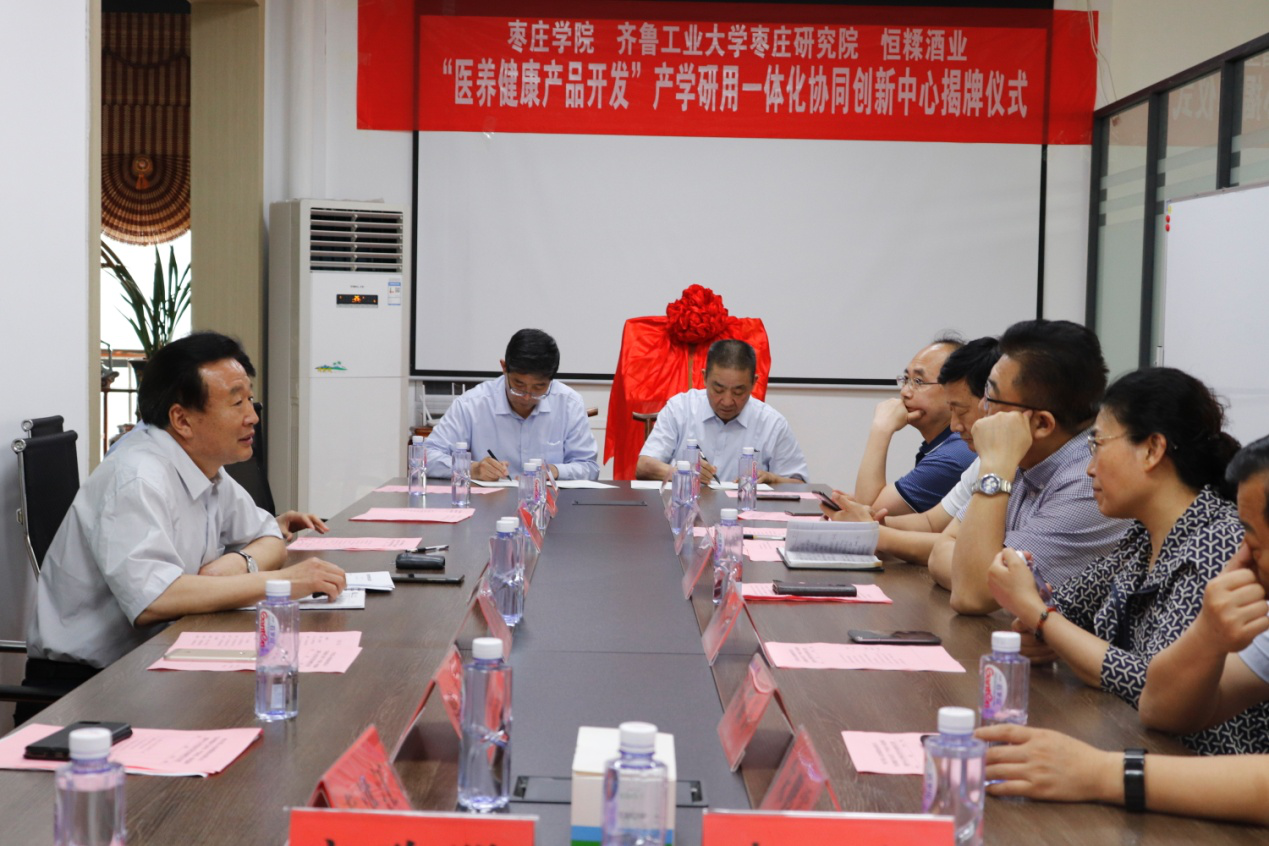 崔西成首先致辞,同时对企业的发展历程和主要运营项目进行了详细介绍。校长李东对学校产教融合办学成效,近年来人才引进、科研以及服务地方等工作取得的成果做了介绍。副市长周宗安对枣庄学院和山东恒糅酒业有限公司在产学研用合作方面取得的成效给予充分肯定和赞赏,并希望双方继续加强合作,争取更多科研成果的转化落地。最后,李东和周宗安共同为枣庄学院-山东恒糅酒业有限公司“医养健康产品开发”产学研用一体化协同创新中心揭牌并合影留念。