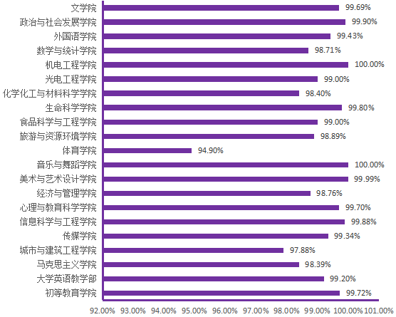 各院(部)的开课数、开课门次、班级数、教师数(人次)、学生数(人次)和学生上课率情况如下图所示:
