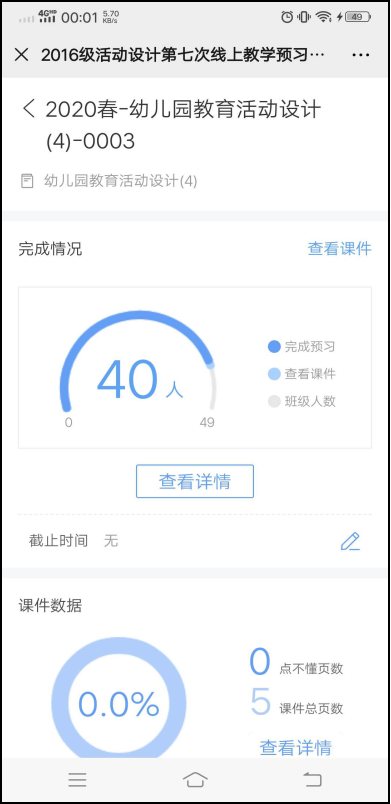 课后通过钉钉实时监测学生观看时长,不仅知道学生上课情况,还能更详细的了解学生上课多长,有助于教师掌握真实的上课情况。对于未观看的同学及时沟通,提醒学生通过观看预习课件、直播视频的方式补课并单独通过作业参加课后检测。