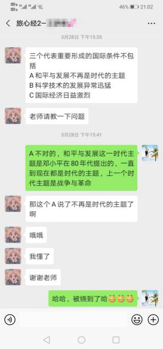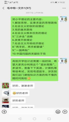 4、在课外做好时政热点的助学者。在做好日常线上教学工作的同时,我还充分利用学习强国、人民日报公众号等平台资源,搜集国际国内的时政热点、党和国家领导人的重要讲话等重要文章或视频发送到专业微信群供学生学习使用,使学生能够实时了解时政动态,增强他们的理论素养,从而做到全方位育人。