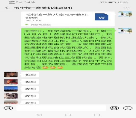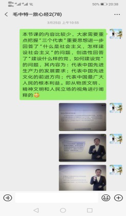 2、在课中做好知识学习的引导者。利用慕课堂小程序引导督促学生观看视频、及时签到、做好笔记、完成测试、参与讨论等,并利用专业微信群就相关的重要知识点和学生提出的疑难问题进行深化讲解、互动交流,使学生真正学懂、弄通、悟透马克思主义中国化的理论成果。与此同时,为防止隔空授课状态下学生上课“顾头不顾尾”、“出工不出力”的现象发生,我会在授课过程中随机点名、作答,以保证全员育人。