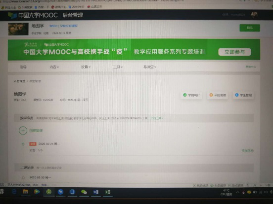 本学期开学前两周,在中国大学慕课上遴选出适合本专业学生的优质同步spoc慕课资源,同时建立慕课堂组织并指导学生进行注册,建立班级QQ群和钉钉群,下载教材电子版,辅助学生进行学习。