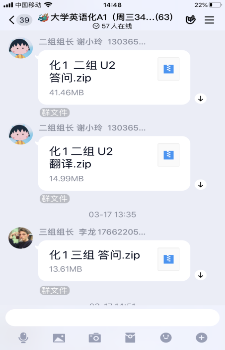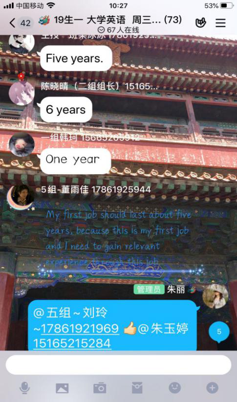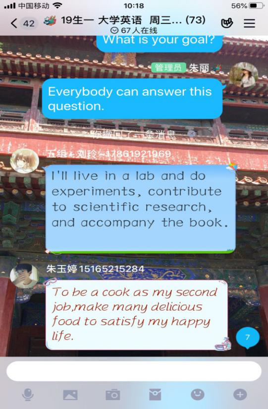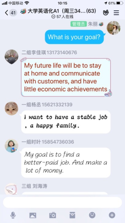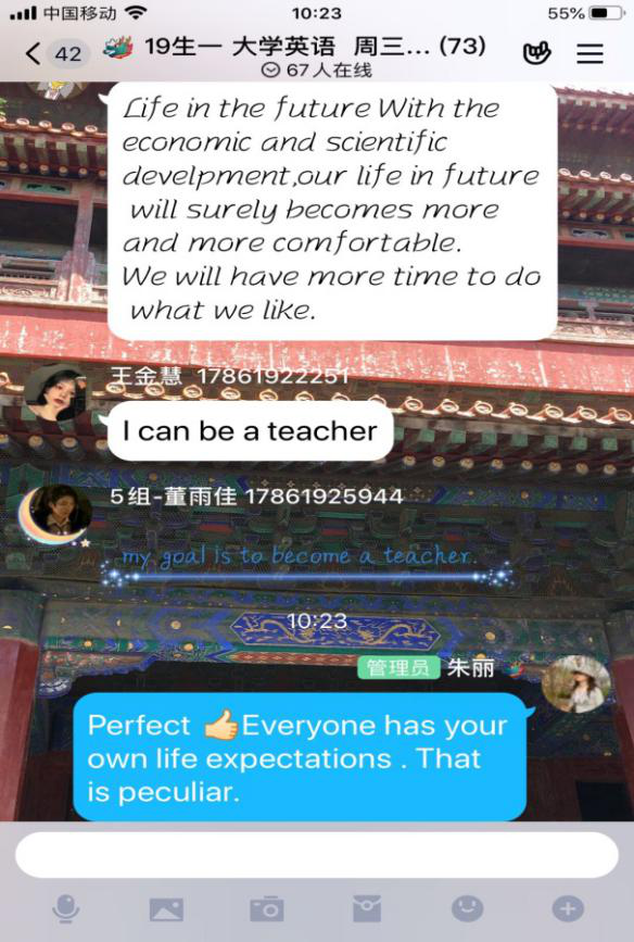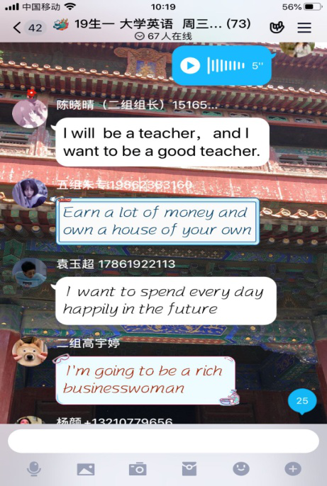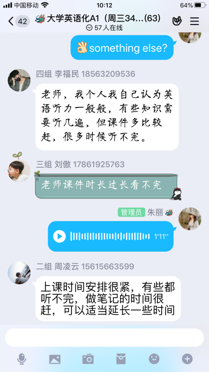 那么,“说”的问题如何在线上保证呢?课上,设置任务,对个别同学进行提问,让他们以发送语音的方式,检测他们听课的效率,并可以及时纠正发音。课下,布置说的练习,各小组在各自组群里进行实时话题讨论,以小组为单位进行录音并传送给老师,邀请个别组在一定时间和老师线上沟通答疑。