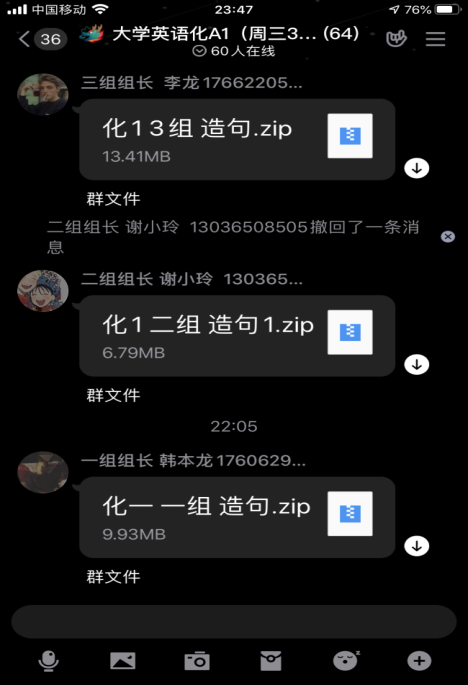 5.通过作业的布置与检查,促进对学生学习状态的管理。为了巩固学生的学习效果,结合听、说、读、写能力提升的不同要求,根据学生实际情况,给学生布置了丰富多样的作业。为了达到训练口语的目的,让学生以语音+文本的形式发送作业,以便及时对学生的发音进行纠正,促进学生听、说能力的提高。