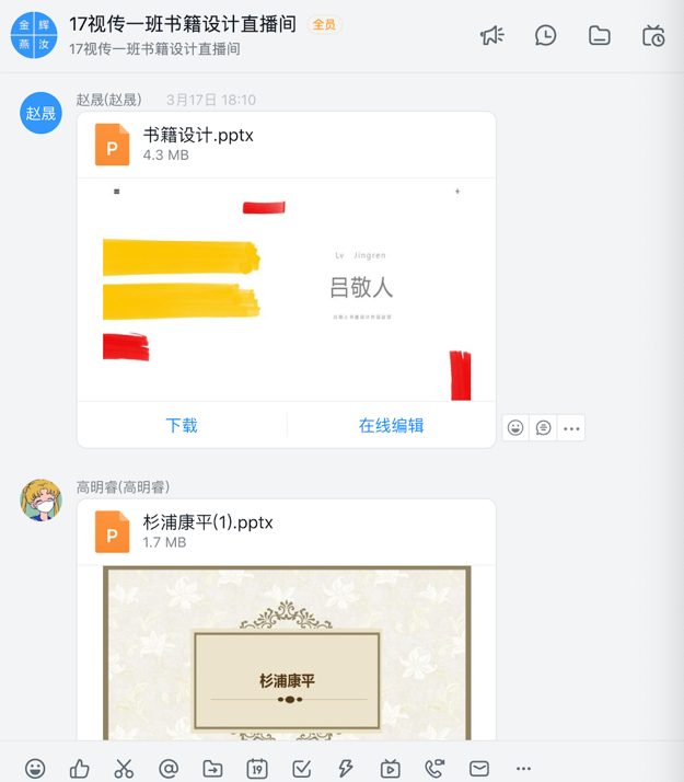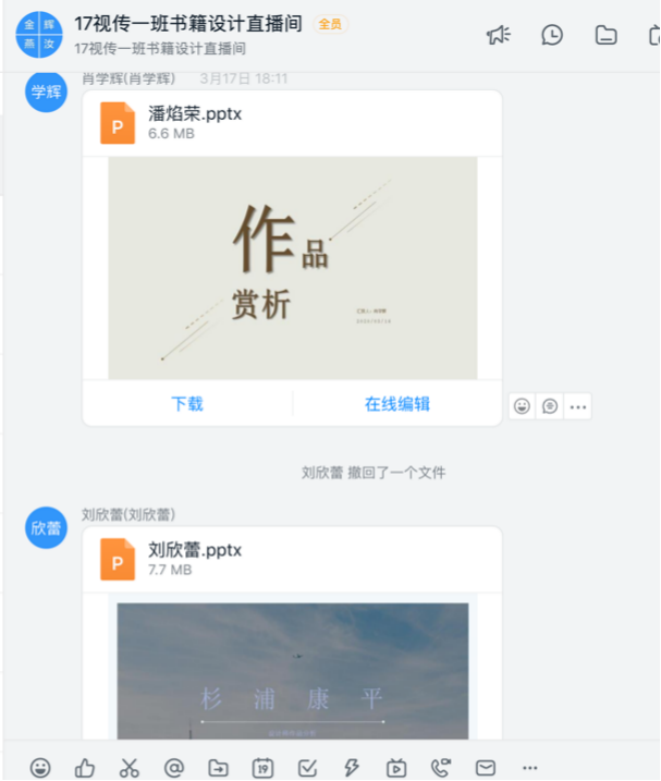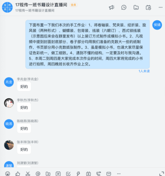 四、任课教师通过自主探究的学习方法让学生通过动手、动眼、动脑、动嘴主动去获取知识,并要求学生将自己的学习成果以ppt形式发在群里,让大家互相学习,同时积极参与到课堂讨论,发表观点,培养学生独立思考的能力,调动学生学习的积极性。教师也分享了大量优秀案例,让学生在做书的过程中获得很多灵感,并了解什么是好的书,什么是美的书。