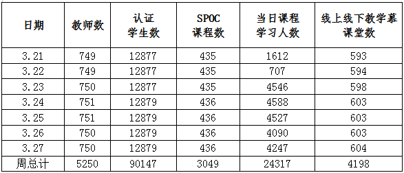 本周运行课程累计周和3049门次,上线教师数5250人次,认证学生周总计90147人次,当日课程学习累计24317人次,线上线下教学慕课堂数4198。
