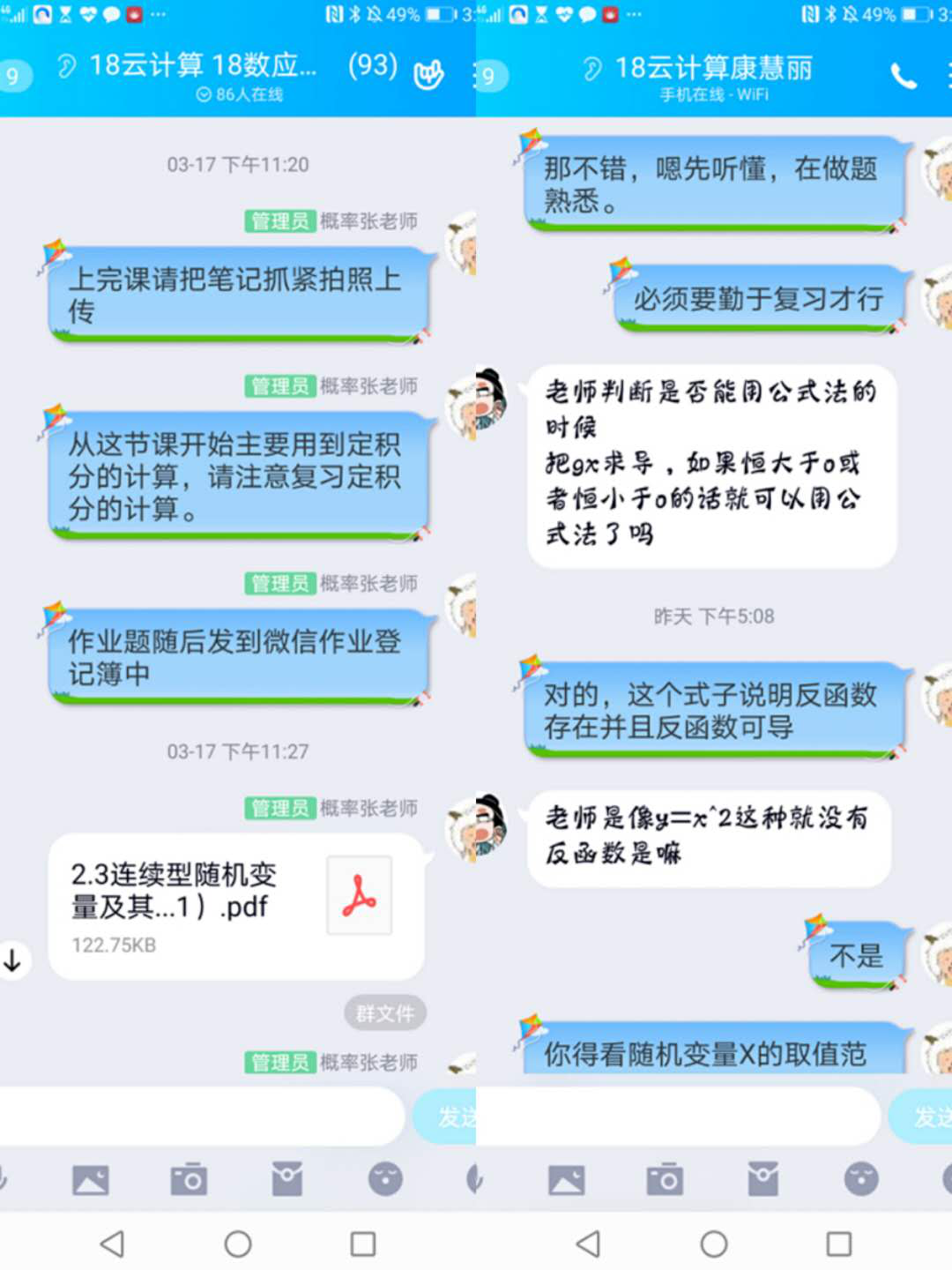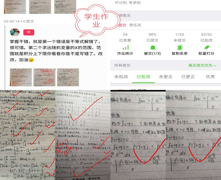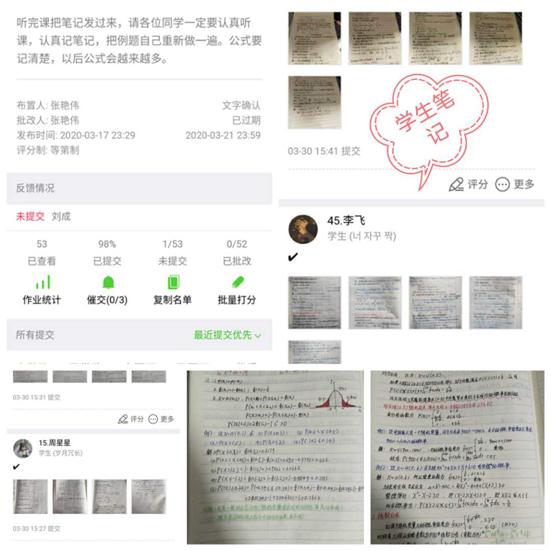 《概率统计》这门课仅仅靠课上听懂是不够的,必须要做一定量的练习。因此每一节课上完,都会出一份自测题发布到微信作业小程序上,要求学生独立完成上交。所有学生的自测题张老师都会认真地批改同时标出错误地方。结合笔记和自测题就能够比较全面地、准确地了解学生的掌握情况。为了让学生更扎实的掌握所学知识,每周二次和学生约好时间利用“QQ视频分享屏幕功能”进行重难点知识梳理和习题的讲解。同时每位同学还可以随时通过QQ或者微信对不明白的问题和老师进行单独的交流、探讨。