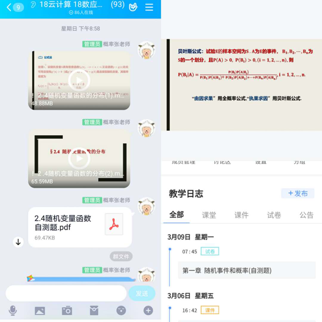 《概率统计》是18级数应本科1班、18级移动云计算本科1班的一门学科教育必修课。数学与统计学院张艳伟老师积极响应学校疫情期间开展 “停课不停学、停课不停教”的线上教学活动,认认真真地开展线上教学,确保班级学生线上学习学有所获、学有所成。在正式开展线上教学之前,将本课程的电子版教材发给每位学生,并且向学生推荐了参考书目。考虑到线上课堂的教学方式相对于线下有很大的区别,因此重新调整了教学进度。同时积极参加学校组织的各种线上教学平台使用的培训,并通过和学生反复测试,最终采用了雨课堂、屏幕录像专家、QQ视频分享屏幕功能、微信作业小程序相结合的教学模式。